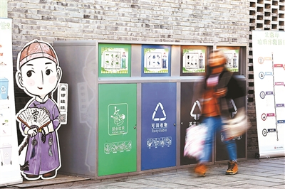 ????????“南鑼地區(qū)有對稱的八條胡同,分類垃圾桶也相應設置了八組,每組垃圾桶分為廚余垃圾、可回收物、其他垃圾三大類。由商戶志愿者擔任垃圾分類引導員,每天中午和晚上客流高峰時間上崗值守,幫助游客開展垃圾分類。有些游客吃完的竹簽子、一次性碗筷不知道怎么扔,志愿者會引導游客正確分類?!?南鑼鼓巷商會會長徐巖介紹,南鑼鼓巷第一個“吃螃蟹”,是全國首個引導游客開展垃圾分類的特色商業(yè)街。