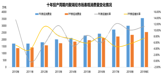 ????????隨著新型城鎮(zhèn)化、新型工業(yè)化、農(nóng)業(yè)現(xiàn)代化和國際貿(mào)易發(fā)展等對(duì)聚烯烴需求的總體支撐,以及國民高質(zhì)量生活、教育、醫(yī)療、養(yǎng)老等服務(wù)性需求提升,聚烯烴在新材料、汽車輕量化、綠色建材、醫(yī)療器械、食品級(jí)包裝、電子電器小型化等方面的應(yīng)用日益廣泛。生育政策放開、人口老齡化、醫(yī)療需求增加等都刺激高品質(zhì)聚烯烴樹脂需求增長,因此近幾年國內(nèi)聚烯烴產(chǎn)能經(jīng)歷了快速到高速的增長。PE非耐消費(fèi)品占比在73%,PP在66%,一次性快消品的需求特征決定其需求相對(duì)穩(wěn)定。