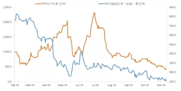 ????????整個產業(yè)上游都在擴張,而終端的需求一直不景氣,這種情形下,依靠變化莫測的原油市場和個別裝置檢修一兩周對市場預期也不會有太大的影響。而目前進入2019年年尾,今年PTA價格不斷創(chuàng)出新低。PTA價格重心下移的原因十分明顯,主要是大量PTA新裝置、尤其是大煉化配套PX新裝置年內持續(xù)投產。
