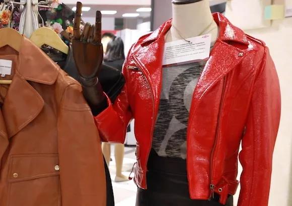 ????????陶氏化學(xué)的展臺(tái)一角,四件人造革服裝擺放在衣架上。這是該公司在中國首發(fā)的水性聚氨酯產(chǎn)品,被應(yīng)用于這些人造革產(chǎn)品的生產(chǎn)過程中。
