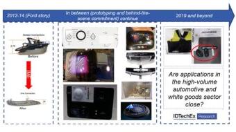 ????????模內(nèi)電子的原型種類(lèi)繁多,從可穿戴技術(shù)的簡(jiǎn)單設(shè)備,汽車(chē)內(nèi)裝,天線和白色家電觸摸面板到更復(fù)雜的傳感器、致動(dòng)器和顯示器等。