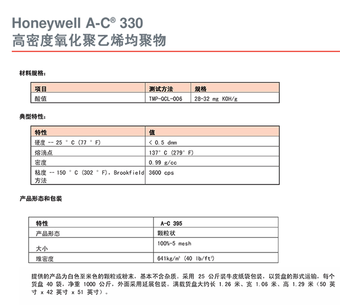 - Honeywell霍尼韋爾 A-C 330 蠟粉 高密度氧化聚乙烯蠟 物性表, Honeywell霍尼韋爾 A-C 330 蠟粉 高密度氧化聚乙烯蠟 產(chǎn)品參數(shù),Honeywell霍尼韋爾 A-C 330 蠟粉 高密度氧化聚乙烯蠟 性能表,Honeywell霍尼韋爾 A-C 330 蠟粉 高密度氧化聚乙烯蠟 出廠報告, MSDS,, 物質(zhì)安全資料表, UL黃卡,{ SGS報告, RoHS, 食品級認(rèn)證, NSF飲用水標(biāo)準(zhǔn), 產(chǎn)品資料, 產(chǎn)品性能, 出廠報告, 原廠原包, 代理商, 熱變形溫度, 熔指數(shù), 流動系數(shù), 抗沖擊性能、沖擊強度, 低溫韌性、低溫抗沖擊性能, 熔體流動系數(shù)、熔體流動速率, 加工工藝、加工參數(shù)、加工溫度, 歐盟RoHS 德國FDA 美國FDA 日本FDA