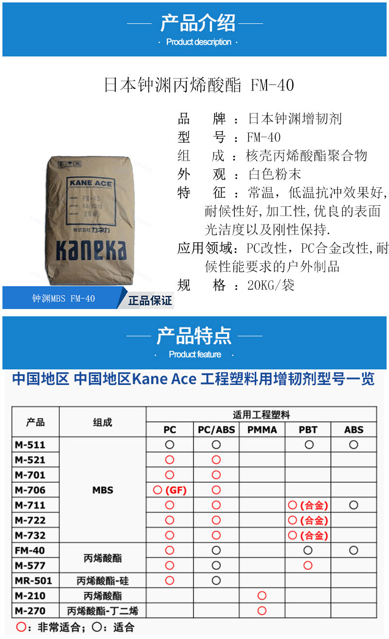 Kane Ace FM-40是一種全丙烯酸酯類核殼型抗沖擊改性劑。