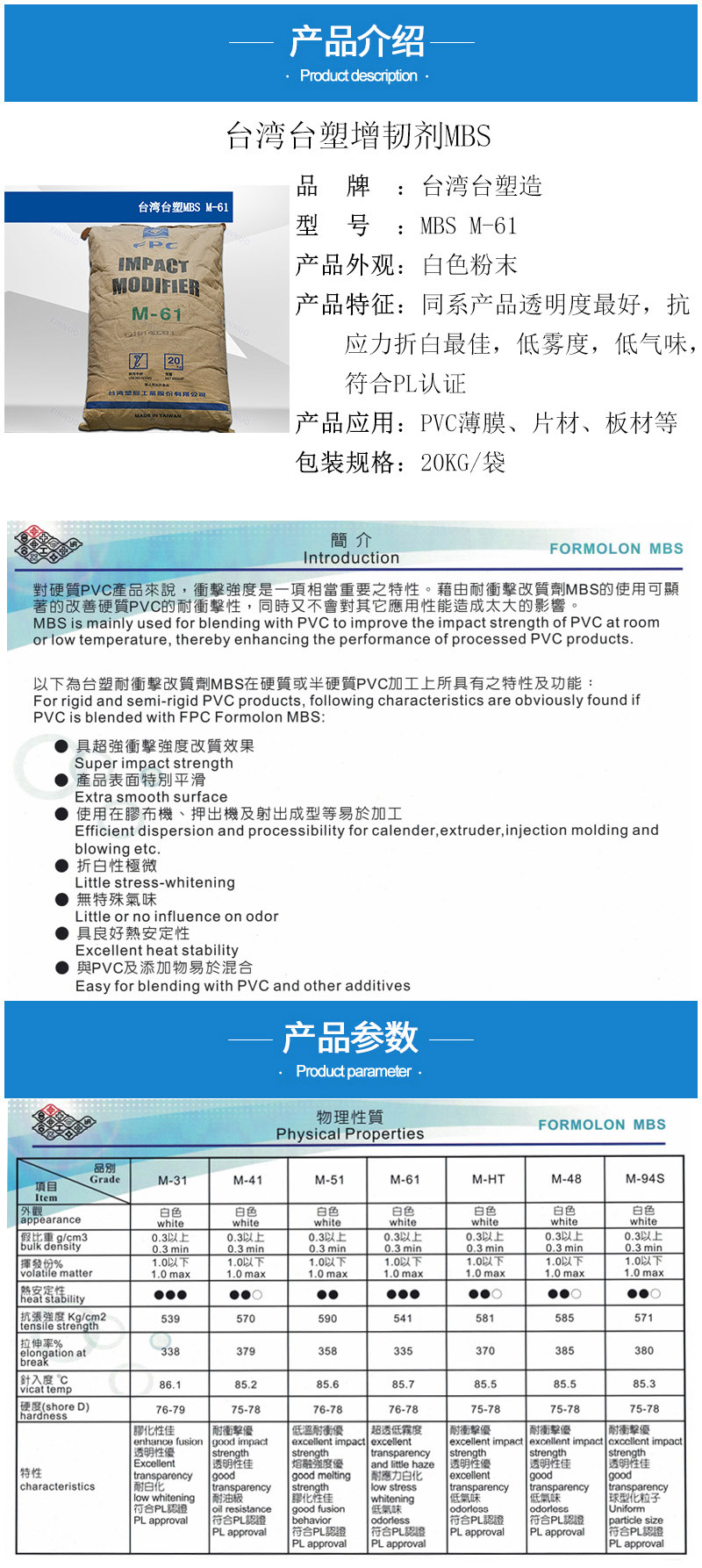- 臺塑MBS M61高透明性 MBS61 抗折白 PVC簿膜片材板材增韌劑M-61 物性表, 臺塑MBS M61高透明性 MBS61 抗折白 PVC簿膜片材板材增韌劑M-61 產(chǎn)品參數(shù),臺塑MBS M61高透明性 MBS61 抗折白 PVC簿膜片材板材增韌劑M-61 性能表,臺塑MBS M61高透明性 MBS61 抗折白 PVC簿膜片材板材增韌劑M-61 出廠報告, MSDS,, 物質(zhì)安全資料表, UL黃卡,{ SGS報告, RoHS, 食品級認(rèn)證, NSF飲用水標(biāo)準(zhǔn), 產(chǎn)品資料, 產(chǎn)品性能, 出廠報告, 原廠原包, 代理商, 熱變形溫度, 熔指數(shù), 流動系數(shù), 抗沖擊性能、沖擊強(qiáng)度, 低溫韌性、低溫抗沖擊性能, 熔體流動系數(shù)、熔體流動速率, 加工工藝、加工參數(shù)、加工溫度, 歐盟RoHS 德國FDA 美國FDA 日本FDA