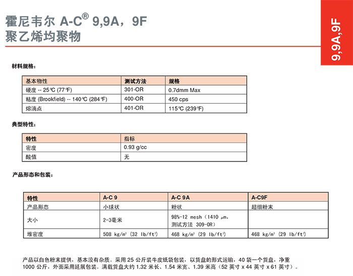 - 霍尼韋爾 A-C® 9A 低密度聚乙烯 (LDPE) 均聚物 物性表, 霍尼韋爾 A-C® 9A 低密度聚乙烯 (LDPE) 均聚物 產(chǎn)品參數(shù),霍尼韋爾 A-C® 9A 低密度聚乙烯 (LDPE) 均聚物 性能表,霍尼韋爾 A-C® 9A 低密度聚乙烯 (LDPE) 均聚物 出廠報告, MSDS,, 物質(zhì)安全資料表, UL黃卡,{ SGS報告, RoHS, 食品級認(rèn)證, NSF飲用水標(biāo)準(zhǔn), 產(chǎn)品資料, 產(chǎn)品性能, 出廠報告, 原廠原包, 代理商, 熱變形溫度, 熔指數(shù), 流動系數(shù), 抗沖擊性能、沖擊強(qiáng)度, 低溫韌性、低溫抗沖擊性能, 熔體流動系數(shù)、熔體流動速率, 加工工藝、加工參數(shù)、加工溫度, 歐盟RoHS 德國FDA 美國FDA 日本FDA
