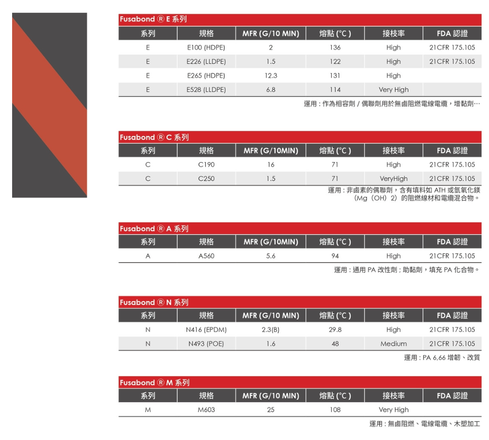 FUSABOND® 馬來酸酐接枝聚合物FUSABOND®為陶氏 (Dow) 的功能性接枝聚合物系列,通常在聚烯烴或工程塑膠中引入相容劑 / 接枝劑的角色。其主鏈為PE 或 PP,並在分子上接枝功能性基團(如馬來酸酐 MAH),藉此改善與極性材料的相容性與黏著性。主要用於提升木塑複合材料 (WPC)與電線電纜 (W&C)的性能。其基材為乙烯-丙烯酸共聚物,再透過無水馬來酸酐 (MAH) 接枝技術製成。FUSABOND® ...