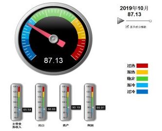 分項(xiàng)景氣指數(shù)中,利潤景氣指數(shù)環(huán)比回升,營收、出口、資產(chǎn)景氣指數(shù)環(huán)比下降,其中:營業(yè)收入景氣指數(shù)85.54,位于“漸冷”區(qū)間,較9月下降0.01點(diǎn);出口景氣指數(shù)為86.66,位于“漸冷”區(qū)間,較9月下降3.59點(diǎn);資產(chǎn)景氣指數(shù)為90.19,位于“穩(wěn)定”區(qū)間,較9月下降0.97點(diǎn);利潤景氣指數(shù)89.91,位于“漸冷”區(qū)間,較9月回升0.82點(diǎn)。
