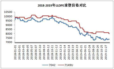 從圖中顯示,2018-2019年國內滾塑料價格明顯高于普通線性,且價格差距逐步擴大,2019年較普通線性高50-850元/噸。目前國內聚烯烴行業(yè)產(chǎn)能過剩,國內石化一直致力于高端產(chǎn)品研發(fā),搶占高端領域,以獲取較大利潤。從線性區(qū)域來看,由于產(chǎn)能過剩,7042價格近兩年一直處于下行通道,削減了石化利潤。線性行業(yè),近年來,研發(fā)主要方向集中在C8線性,茂金屬、滾塑料等,其中滾塑料做為一個分支,近年研發(fā)較多。