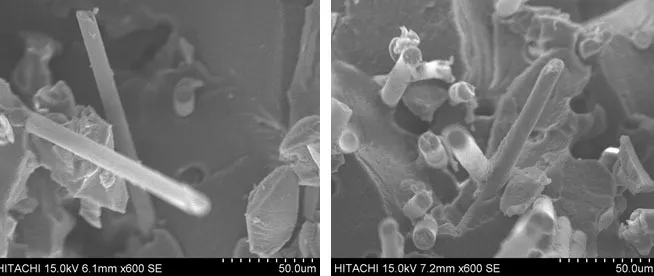 ????????由上圖可知,未添加POE-g-MAH的沖擊樣條斷面上的玻纖表面很光滑,并沒有明顯的尼龍基體包覆的跡象,說明在未添加POE-g-MAH的高溫尼龍?bào)w系中,玻纖與樹脂之間的結(jié)合并不好;而添加了5% POE-g-MAH的PA6T/66體系的樣條斷面上,發(fā)現(xiàn)其中的玻纖表面有較明顯的褶皺,表明玻纖表面被基體樹脂有效包覆,POE-g-MAH起到了界面相容劑的作用。