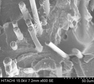 ????????由下圖可知,未添加POE-g-MAH的PA66體系中,玻纖與樹脂之間有良好的結(jié)合,其玻纖上有明顯的尼龍樹脂的包覆。