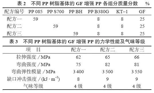 ????????可以看出,無論P(yáng)P基體是粉料還是粒料,不同配方材料的氣味等級(jí)均為4 級(jí)。由此推測在GF增強(qiáng)PP體系中,氣味的最根本來源在于相容劑PP-g-MAH。