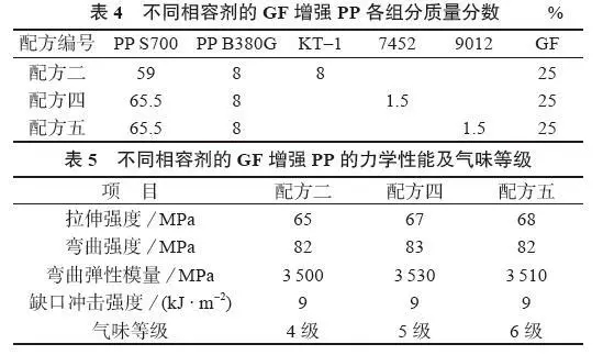 ????????可以看出,由于KT-1為熔融接枝的PP-g-MAH,因其接枝率不高(一般為0.8%),需要的用量大,加之其單體殘留多,因此材料氣味等級(jí)低。