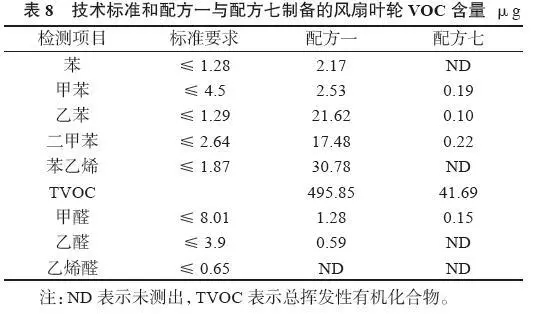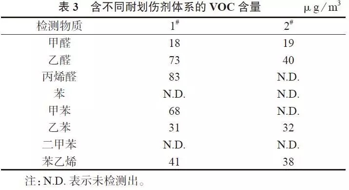 ????????1# 和2# 所散發(fā)的總揮發(fā)性有機(jī)化合物(TVOC) 含量分別為18.47 μgC/g和14.16 μgC/g,兩個(gè)體系的TVOC含量均滿足要求( 低于50 μgC/g)。但從表中可以看出,2#在氣味等級(jí)和VOC方面總體上均低于1#。