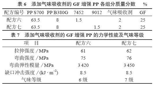 ????????添加氣味吸收劑之后,材料的力學(xué)性能有所下降,但下降幅度較小,而氣味等級(jí)均比原來提高一個(gè)等級(jí)。