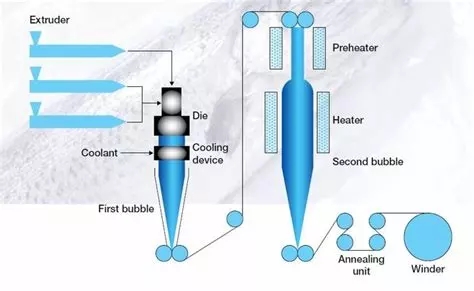 ????????三泡法熱收縮袋生產(chǎn)工藝及原理。其三泡法工藝流程一般如下: