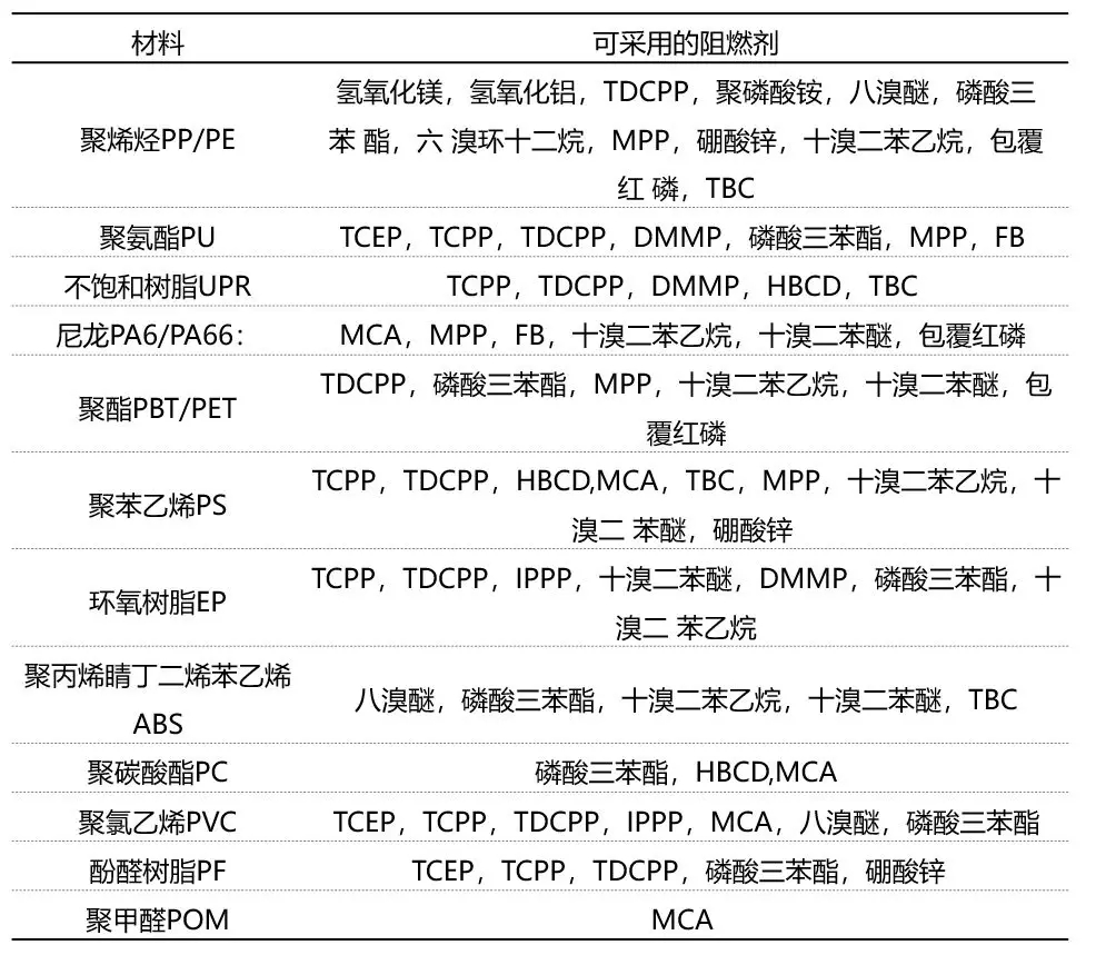 ????????下表是比較常見改性材料常用阻燃劑。當(dāng)然,除了表格中列出的,許多新的磷氮系阻燃劑都已經(jīng)被開發(fā)出來或正在開發(fā)中。雖然很多新產(chǎn)品有著各種各樣的問題,但是隨著研究人員的研究不斷深入,我們相信這些新產(chǎn)品會(huì)很快應(yīng)用于工業(yè)生產(chǎn)中。