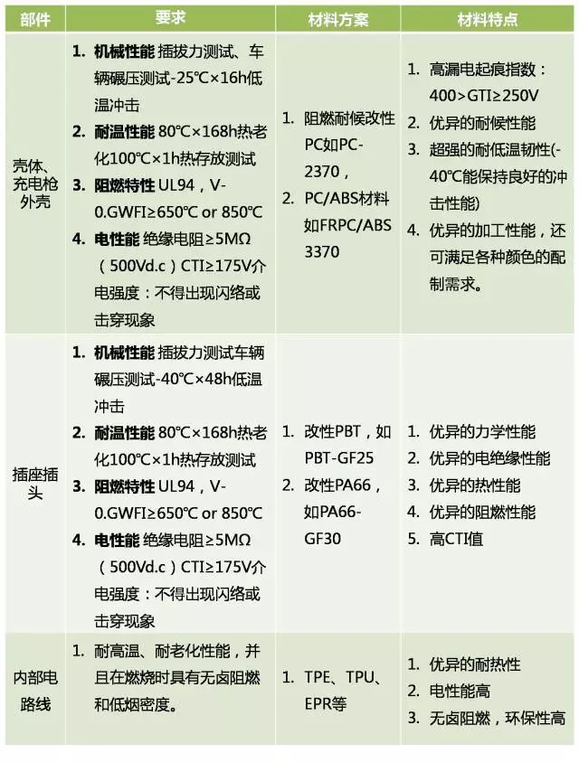 ????????充電設(shè)施的標(biāo)準(zhǔn)目前也尚不完全一致。由于不同電動汽車的電壓平臺不同,再加上接口、通訊協(xié)議等技術(shù)因素的不同,這直接導(dǎo)致了樁與樁之間不能互聯(lián)互通,而且車樁不匹配的問題非常突出。充電設(shè)施包括充電樁、高壓線、高壓接插件和充電槍等高壓部件。其重要性與車內(nèi)的動力電池一樣,都需要考慮充電的阻燃性、安全性等方面。根據(jù)目前國內(nèi)發(fā)布的充電設(shè)施的標(biāo)準(zhǔn)和要求,我們對充電樁和充電槍外殼、插座插頭以及內(nèi)部的高壓線束的阻燃材料進(jìn)行了整理,并列舉了目前充電設(shè)施的產(chǎn)品,對相應(yīng)的材料性能特點(diǎn)進(jìn)行分析。