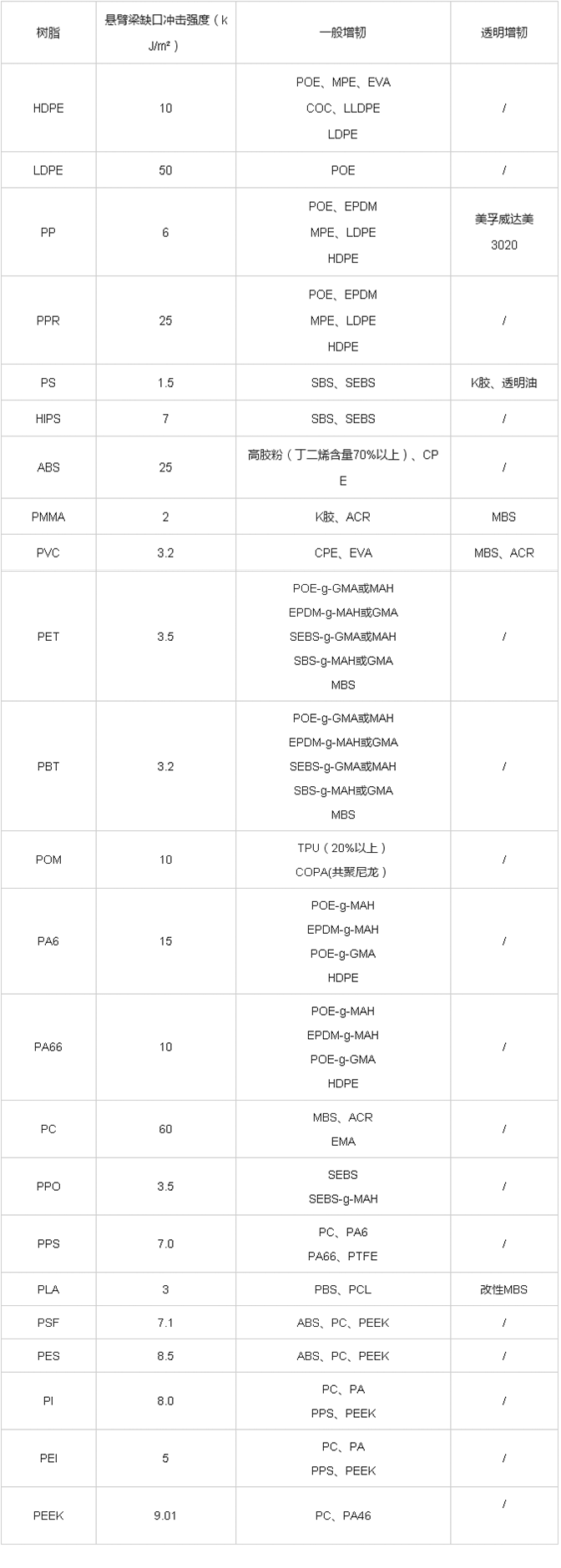 表2?不同塑料的懸臂梁缺口沖擊強(qiáng)度和適合的增韌劑品種