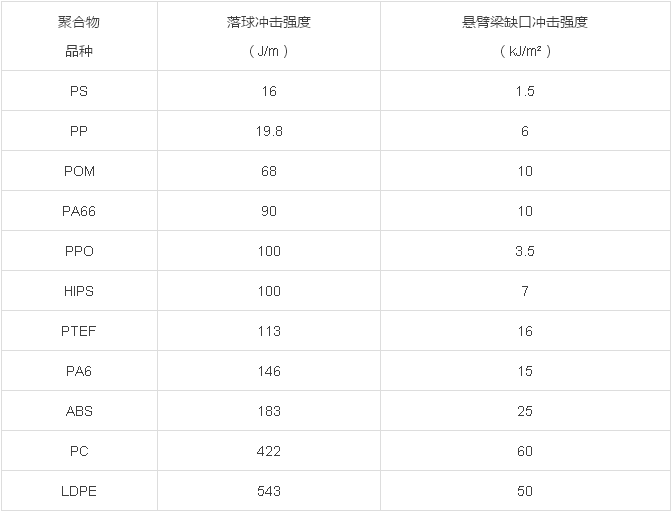 ????????不同塑料的沖擊強(qiáng)度相差很大,具體如表1和表2所示,以落球沖擊強(qiáng)度比較最大的塑料為LDPE、沖擊強(qiáng)度最小的為PS,以懸臂梁缺口沖擊強(qiáng)度比較PC最大、PS最小、PPO次之。