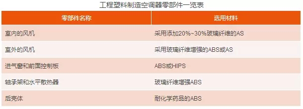 ????????空調(diào)一般分為室內(nèi)機(jī)和室外機(jī)兩部分。室內(nèi)機(jī)所用塑料占到總重量的30%以上,其中使用最廣泛的是ABS和HIPS。空氣過濾器是由PP纖維在PP支架上圍織,排水管用軟質(zhì)PVC擠出。室外機(jī)殼體已經(jīng)逐漸采用塑料代替鋼板,其中進(jìn)氣窗和控制板采用HIPS制備,貫流風(fēng)機(jī)部件采用玻纖增強(qiáng)ABS,室外機(jī)殼體目前采用耐候PP制備。