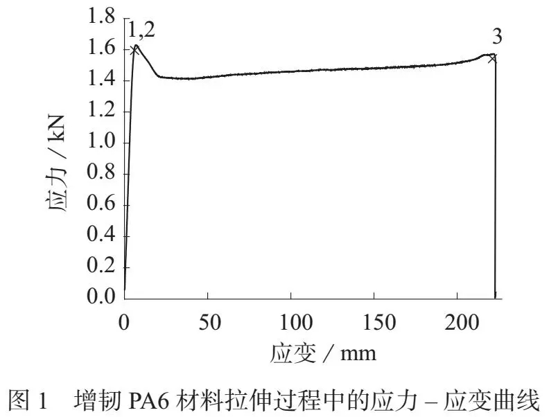 ????????斷裂強度在增韌PA6 材料拉伸曲線中的位置如圖1 中的3 點所示。從表1 可看到,一次擠出過程得到的增韌PA6 材料斷裂強度為48.18 MPa,經(jīng)過二次擠出過程后,增韌PA6 材料的斷裂強度下降到40.78 MPa,這與2擠出工藝對增韌PA6 材料拉伸強度的影響十分相似,說明這一性能對擠出過程以及氧化降解缺陷非常敏感。