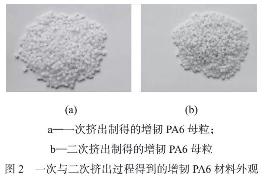 ????????在二次擠出過程中雖然加入了與一次過程等量的抗氧劑,但是增韌PA6 材料仍然發(fā)生了明顯的氧化現(xiàn)象,一次與二次擠出過程得到的增韌PA6 材料外觀如圖2 所示。從圖2 可以看到,二次擠出過程得到的增韌PA6 顆粒顏色明顯比一次擠出過程顆粒顏色深,說明二次擠出過程增韌PA6 材料發(fā)生了更多的氧化降解,因此二次擠出過程中得到的增韌PA6材料的拉伸強度更低。