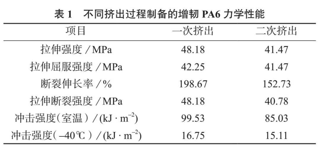 ????????以PA6、聚烯烴增韌劑、抗氧劑為原料,研究一次擠出和二次擠出制備的增韌PA6 材料的拉伸強度、拉伸屈服強度、斷裂伸長率、拉伸斷裂強度、室溫和–40℃沖擊強度?。