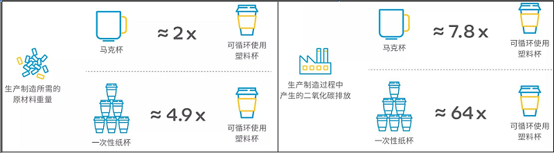 研究數(shù)據(jù)顯示:以一個普通大小的杯子為例,可循環(huán)使用的塑料杯對比馬克杯和一次性紙杯,無論在生產過程中的原材料損耗還是二氧化碳排放都占據(jù)優(yōu)勢。