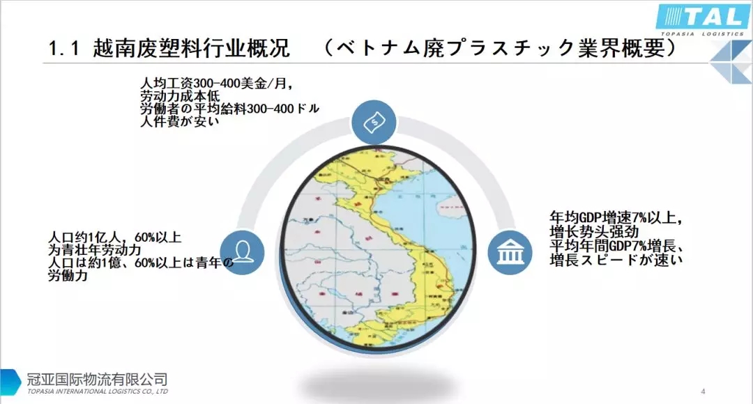 ????????越南廢塑料需求位居?xùn)|南亞各國(guó)之首,再生塑料在越南的市場(chǎng)有PET,PP,PE,PS,ABS,PA。主要進(jìn)口港口:海防,胡志明。