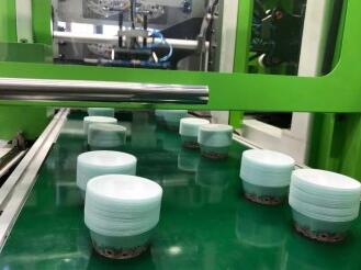 ????????伊之密PacPro薄壁包裝產(chǎn)品成型方案在現(xiàn)場(chǎng)也進(jìn)行了展示,2.2秒內(nèi)高速成型一出四貼標(biāo)圓形容器。