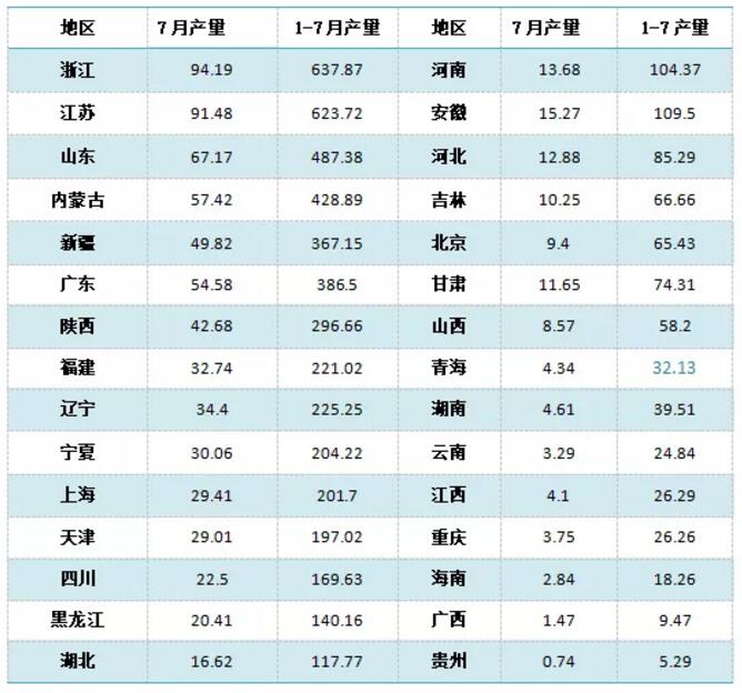 ????????1-7月初級形態(tài)塑料產(chǎn)量排名前五位(浙江、江蘇、山東、內(nèi)蒙古和廣東)的總產(chǎn)量達到2564.36萬噸,占到全國總產(chǎn)量47%。(按7月規(guī)模企業(yè)統(tǒng)計)