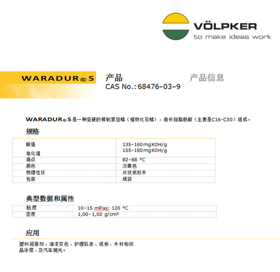 WARADUR RS是一種精制的,非常堅硬的褐煤蠟(化石植物蠟),由長鏈脂肪酸(主要是C16-C30)組成。作為高性能潤滑劑??捎糜谌軇┬头稚Ⅲw。