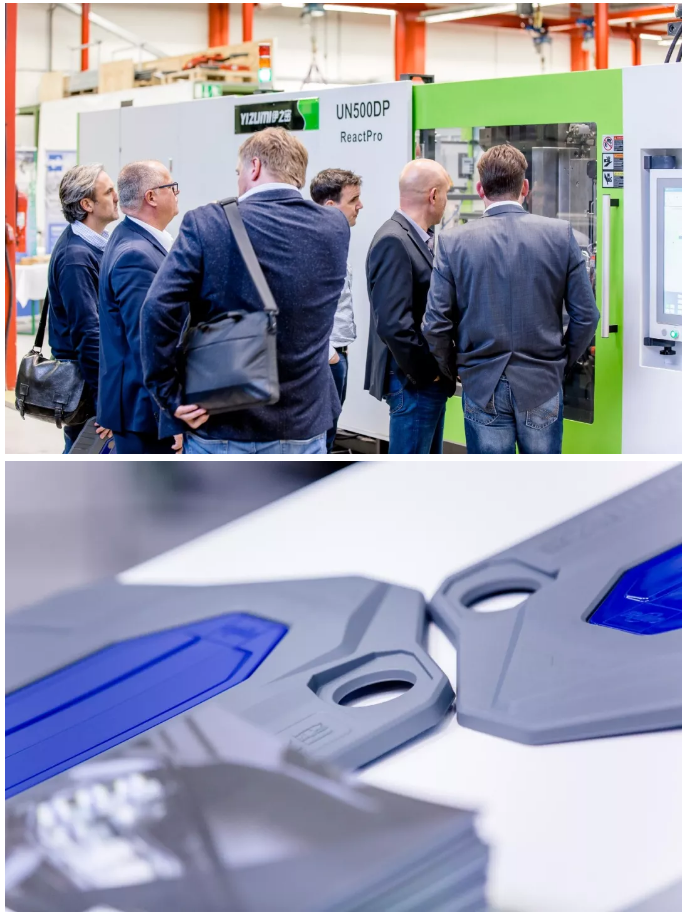 伊之密與合作伙伴Frimo提供的ReactPro方案,將注射成型與聚氨酯(PUR)包覆工藝結(jié)合在一起,更簡單、更模塊化、更靈活、更具成本效益。在Frimo總部舉行的聯(lián)合技術(shù)開放日上,第一套高度集成和自動化的ReactPro系統(tǒng)亮相,現(xiàn)場生產(chǎn)帶聚氨酯表面的發(fā)動機(jī)蓋,吸引了不少感興趣的專業(yè)觀眾。